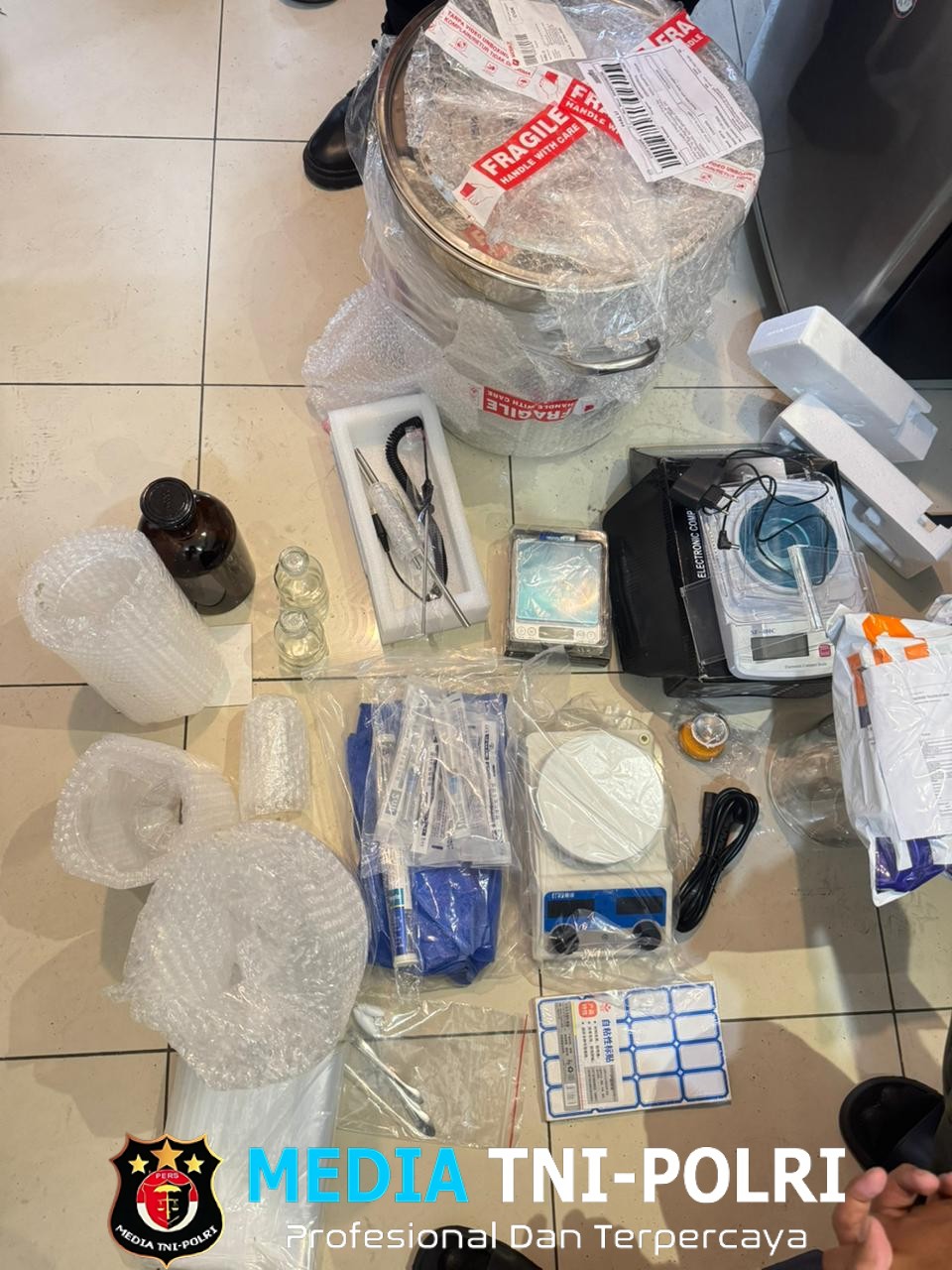 “Dari penggeledahan unit apartemen tersangka, polisi menemukan satu paket narkotika jenis etomidate seberat bruto 100 gram serta berbagai peralatan yang diduga digunakan untuk kegiatan produksi narkotika. Barang bukti yang diamankan antara lain tabung laboratorium, alat suntik, timbangan digital, alat aduk kaca, bahan kimia, dan perlengkapan pendukung lainnya” dalam keterangannya Rabu (14/01/2026).