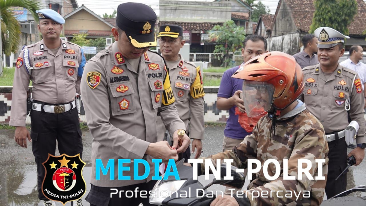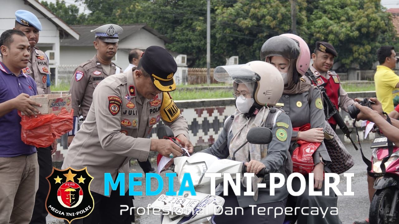 Dengan senyum ramah dan humanis, Kapolres bersama jajarannya memasangkan Bendera Merah Putih di kendaraan masyarakat yang melintas..