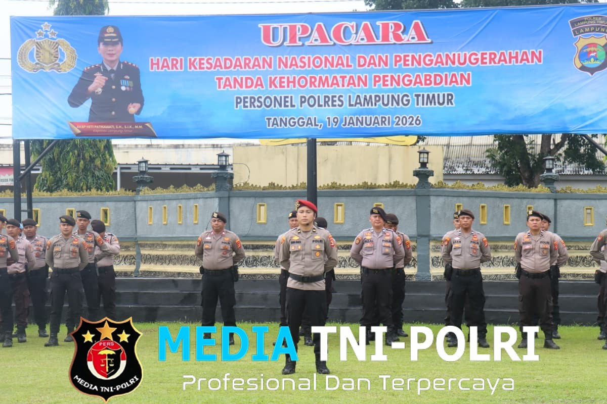 LAMPUNG TIMUR // MEDIATNI-POLRI.COM / Polres Lampung Timur melaksanakan Upacara Hari Kesadaran Nasional yang dirangkaikan dengan Penganugerahan Tanda Kehormatan Pengabdian kepada personel Polri, bertempat di Lapangan Satya Haprabu Polres Lampung Timur, pada Senin pagi (19/1/2026).