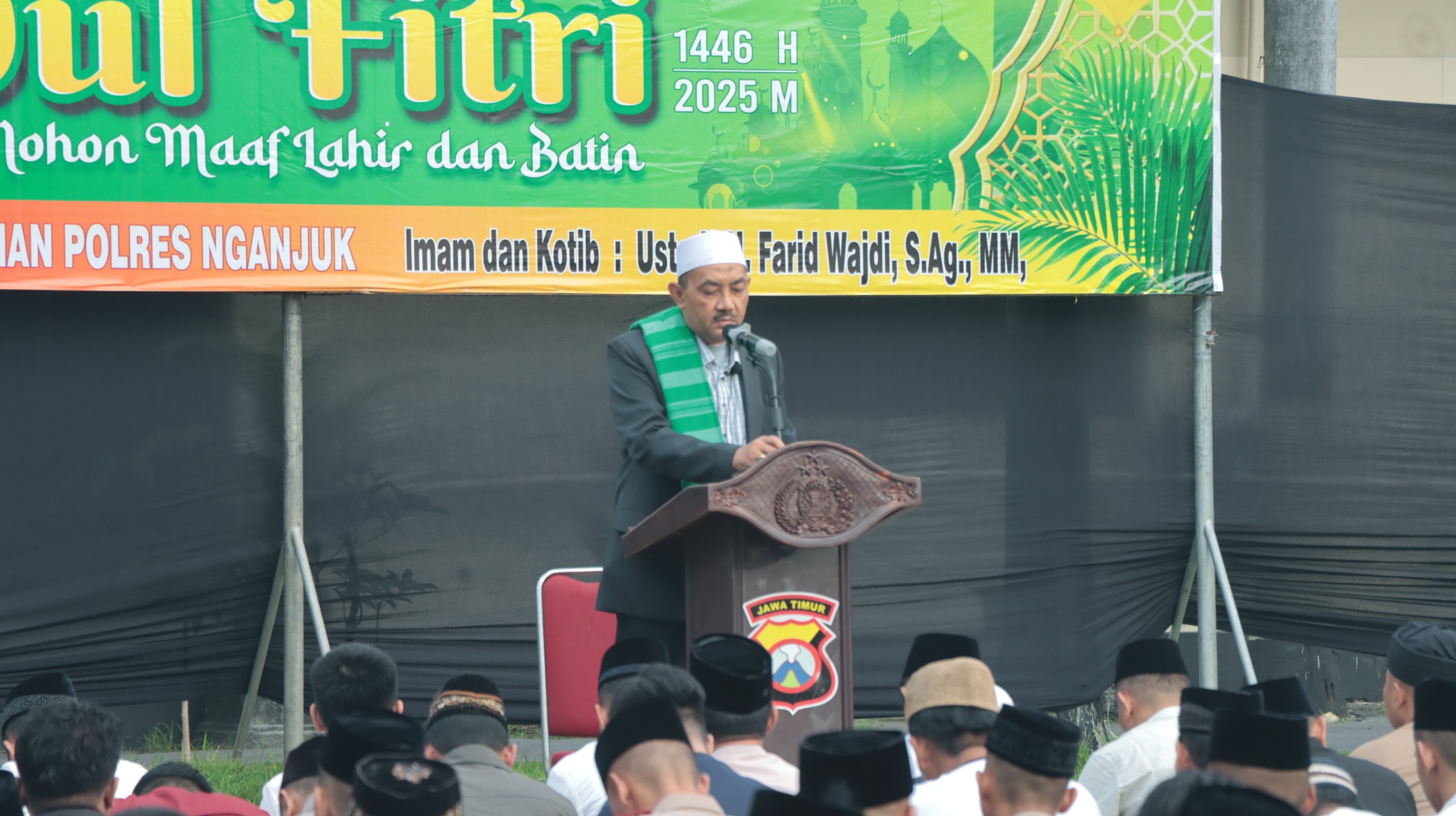 Ustadz H. Farid Wajdi, S.Ag., MM., Kepala Urusan Haji Kemenag Kabupaten Nganjuk, dalam khotbahnya menyampaikan bahwa Idulfitri merupakan momentum untuk kembali ke fitrah dengan meningkatkan keimanan dan amal ibadah secara berkelanjutan.