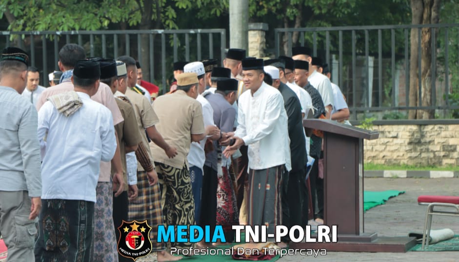 Usai sholat, Kapolres dan jajaran bersalaman dengan masyarakat sebagai wujud kebersamaan dan silaturahmi di hari yang fitri.