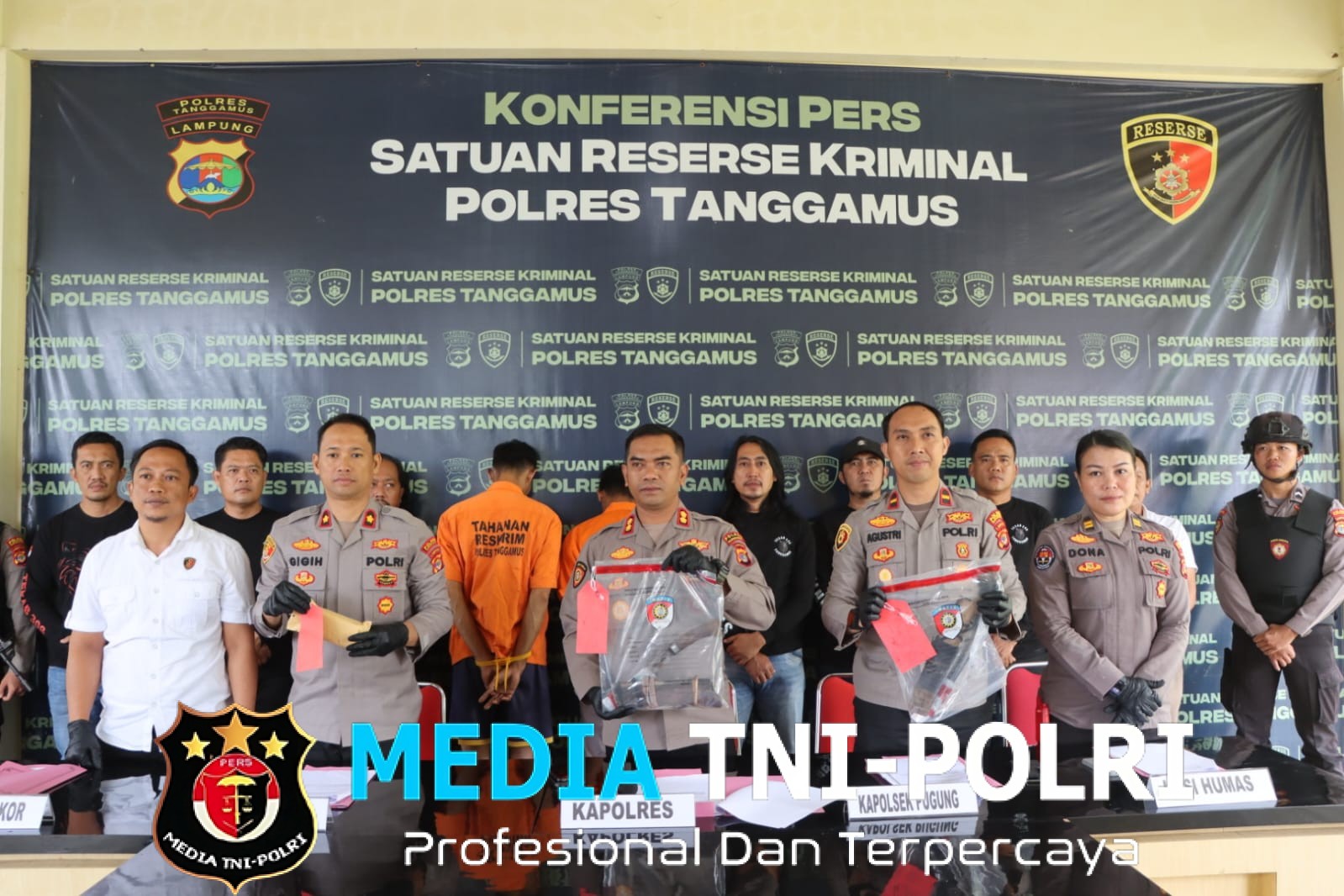 Penetapan tersangka disampaikan Kapolres Tanggamus AKBP Rahmad Sujatmiko, S.I.K., M.H., dalam konferensi pengungkapan kasus di basemant Sat Reskrim Polres Tanggamus.