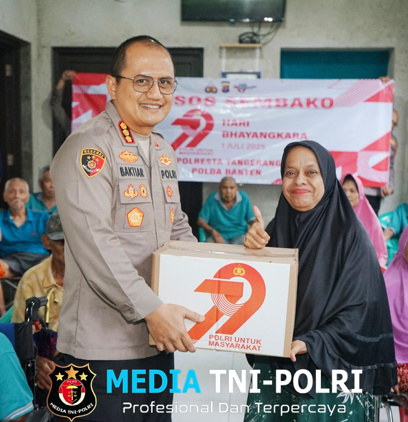 Tangerang // mediatni-polri.com / Dalam rangka memperingati Hari Ulang Tahun (HUT) Bhayangkara ke-79 tahun 2025, Polresta Tangerang menyalurkan bantuan sosial (bansos) berupa paket sembako kepada warga di Pondok Lansia Berdikari, Kampung Tapos Tengah, Desa Tapos, Kecamatan Tigaraksa, Kabupaten Tangerang, Rabu (18/6/2025).