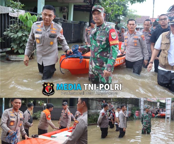 Kapolres Metro Depok Kombes Abdul Waras bersama jajaran dan unsur TNI meninjau langsung kondisi banjir di Kelurahan Sawangan Baru, Kecamatan Bojongsari.