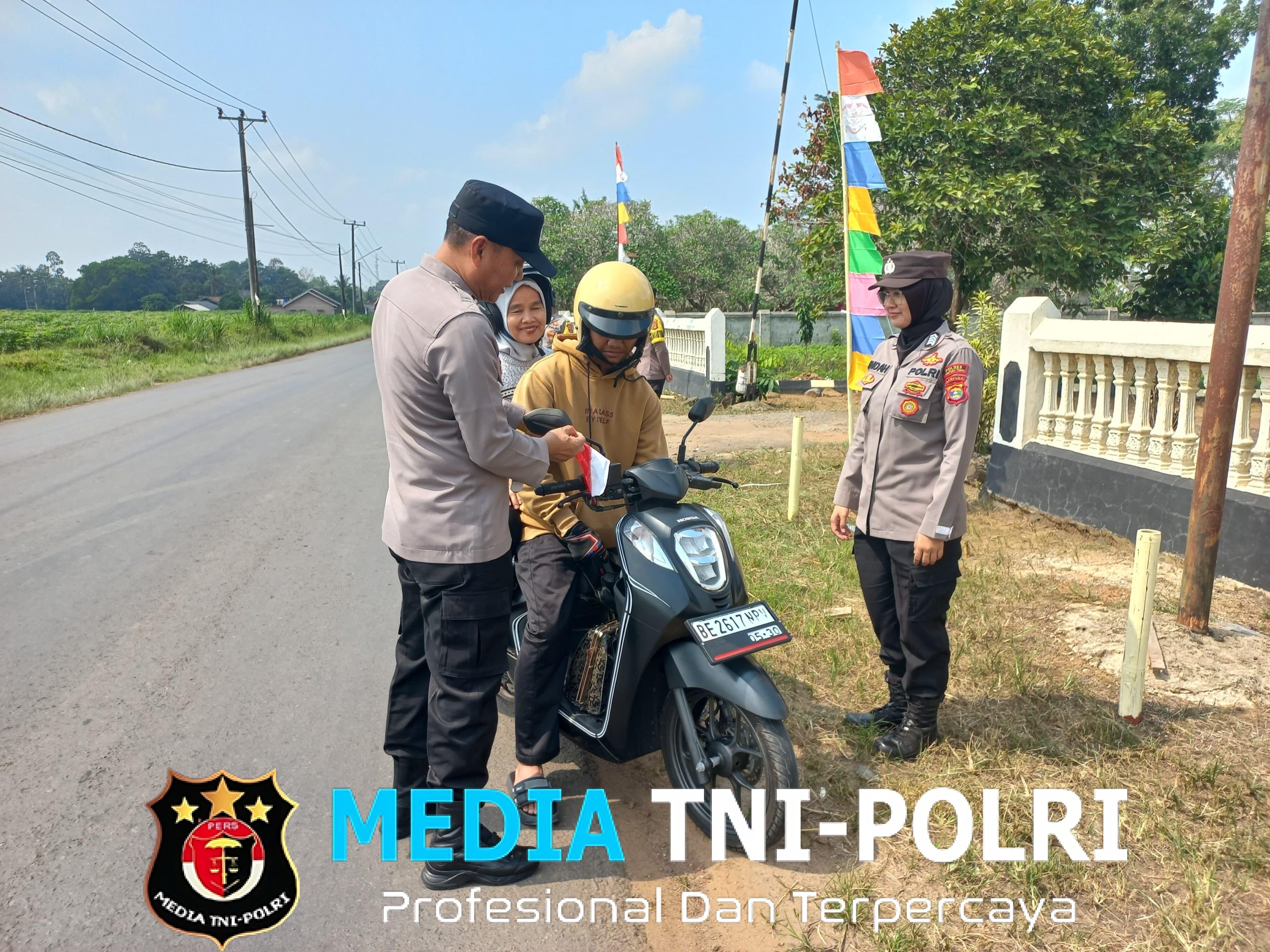 menggelar kegiatan pembagian dan pemasangan Bendera Merah Putih kepada para pengguna jalan raya yang melintas di depan Mako Polsek Bandar Sribhawono, Jalan Ir. Sutami, Desa Sribhawono, Kecamatan Bandar Sribhawono, Kabupaten Lampung Timur.