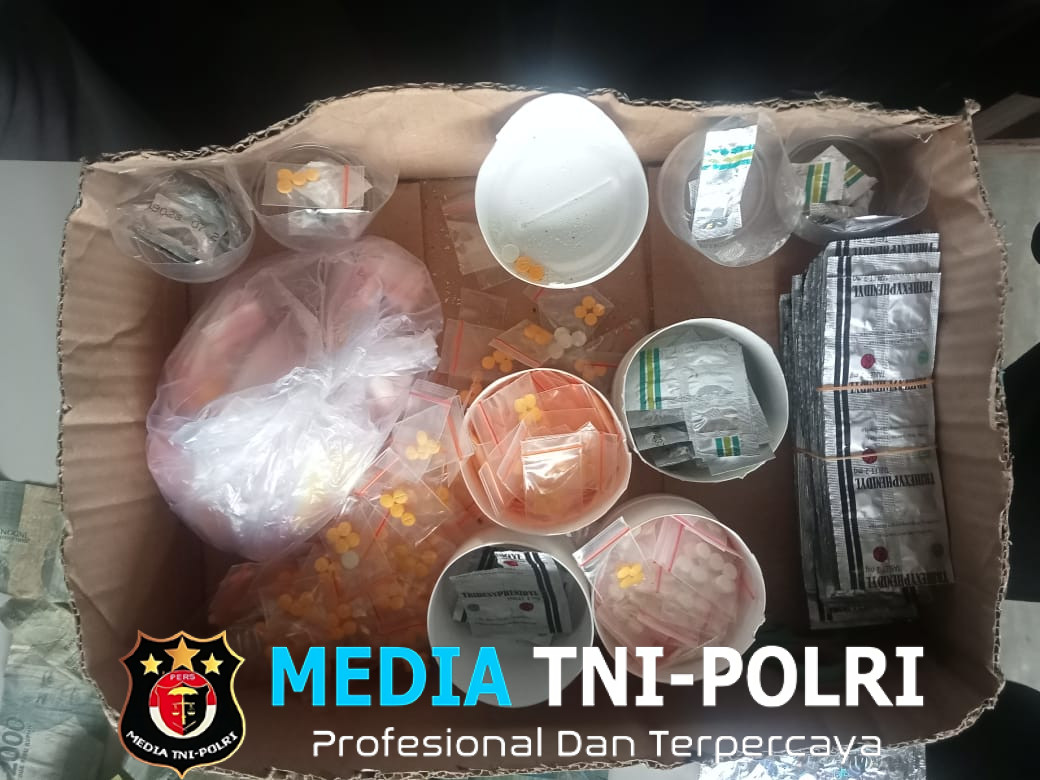 “Barang bukti dan barang-barang yang berhasil diamankan, Obat Jenis Xsimer sebanyak 720 Butir, Obat Tri x (berwarna putih) sebanyak 995 Butir, Obat Jenis Tramadol Sebanyak 160 Butir, Obat Jenis Trihexyphenidyl sebanyak 395 Butir, Uang tunai pecajan Rp. 100.000,- sebayak 1 lembar, Uang tunai pecahan Rp. 50.000,- sebanyak 3 lembar, Uang tunai pecahan Rp. 20.000,- sebanyak 2 lembar, Uang tunai pecahan Rp. 10.000,- sebanyak 5 lembar, Uang tunai pecahan Rp. 5.000,- sebanyak 26 lembar, Uang tunai pecahan Rp. 2000,- sebanyak 173 lembar, Uang tunai pecahan Rp. 1.000,- sebanyak 27 lembar,” kata Kapolsek.