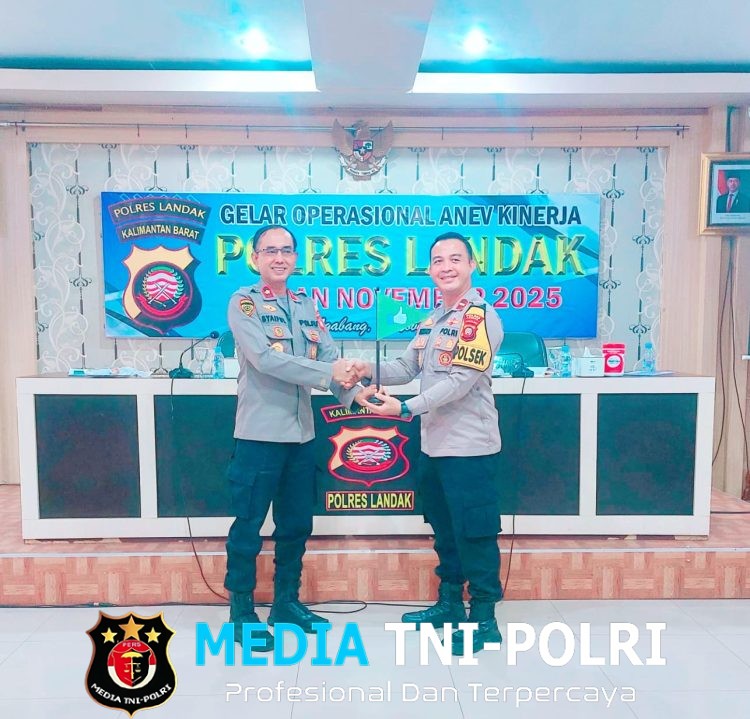 LANDAK // MEDIATNI-POLRI.COM / Polsek Mandor~ Polres Landak ~ Polda Kalbar ~ Dalam kegiatan Analisa dan Evaluasi (Anev) kinerja yang berlangsung di Ruang BKPM Polres Landak, Selasa (11/11/2025), Waka Polres Landak Kompol Syaiful Bahri, S.IP., M.Sos memberikan penghargaan kepada Polsek Mandor atas capaian kinerja terbaik dalam pelaporan aplikasi BOS V2.