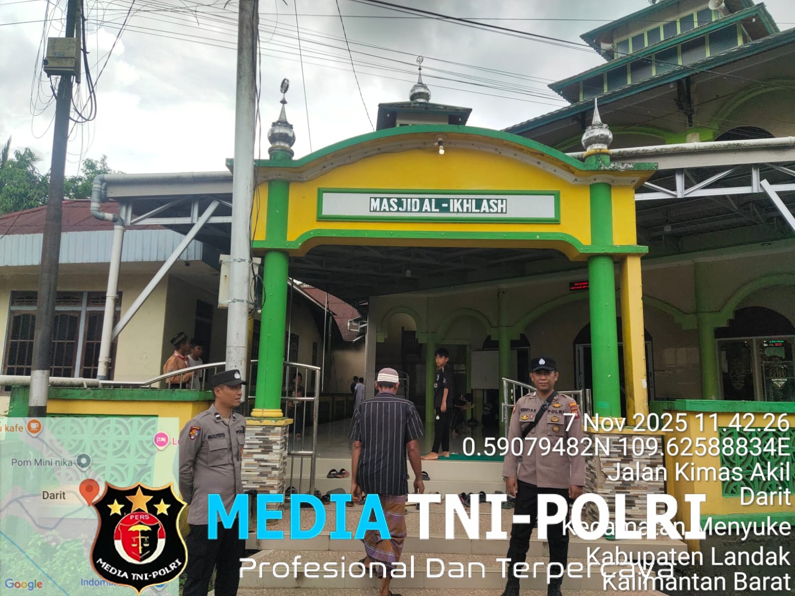 LANDAK // MEDIATNI-POLRI.COM / Yang di lakukan oleh Samapta Polsek Menyuke Polres Landak berikan pengamanan kepada warga Agar kegiatan Sholat Jum’at ke Masjid Al-Ikhlas Darit di Desa Darit Kecamatan Menyuke Kabupaten Landak, pada hari Ju’mat, tanggal (07/11/2025) Siang.