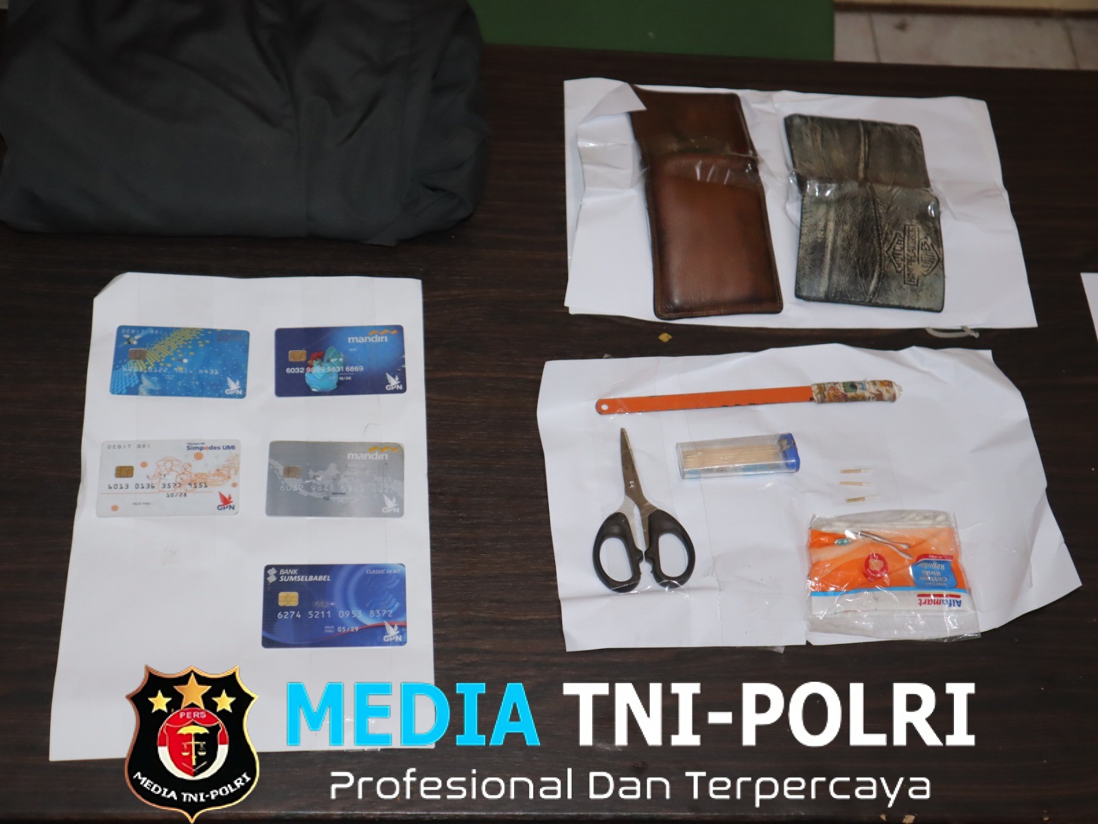 “Dari tangan pelaku, polisi menyita sejumlah barang bukti berupa sejumlah tusuk gigi dan cotton bud yang digunakan untuk mengganjal mesin ATM, gergaji besi dan gunting untuk menarik kartu ATM korban, dompet berisi lima kartu ATM, serta sepeda motor yang digunakan dalam aksi kejahatan.” bebernya