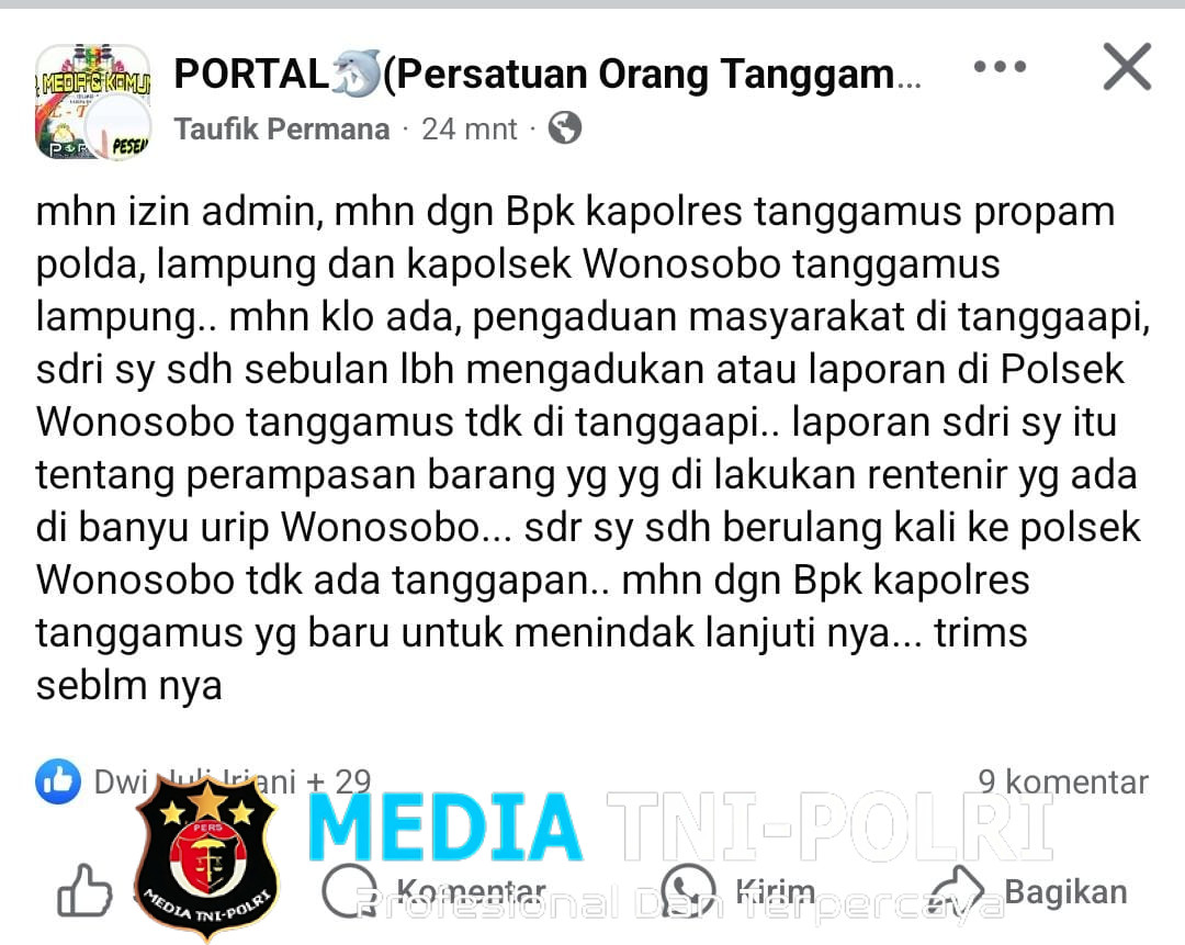 Akun Taufik menyebut, saudarinya telah menjadi korban dugaan perampasan barang oleh sejumlah oknum penagih hutang (rentenir), namun belum mendapatkan respons sesuai harapan dari Polsek Wonosobo.