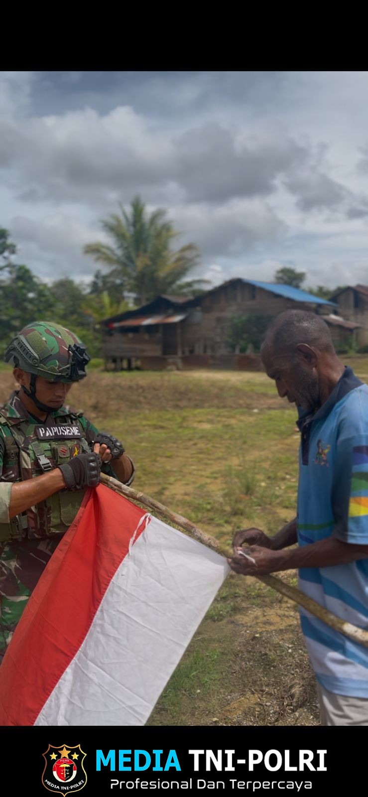 SELAL, PEGUNUNGAN BINTANG // MEDIATNI-POLRI.COM / Menyambut HUT ke-80 Kemerdekaan Republik Indonesia, prajurit Pos Selal Satgas Pamtas RI–PNG Yonif 751/Vira Jaya Sakti (VJS) bersama masyarakat melaksanakan kerja bakti pemasangan umbul-umbul dan bendera Merah Putih di lingkungan kampung pada Rabu (13/8/2025).
