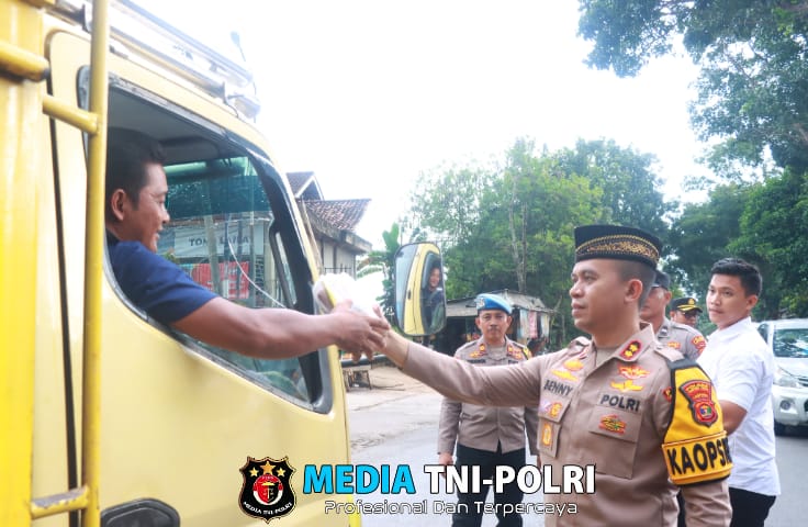 LAMPUNG TIMUR // MEDIATNI-POLRI.COM / Kapolres Lampung Timur, AKBP Benny Prasetya, membagikan takjil kepada pengendara motor dan mobil di depan Pertamina, Jalan Lintas Timur, Desa Bumi Tinggi, Kecamatan Bumi Agung.