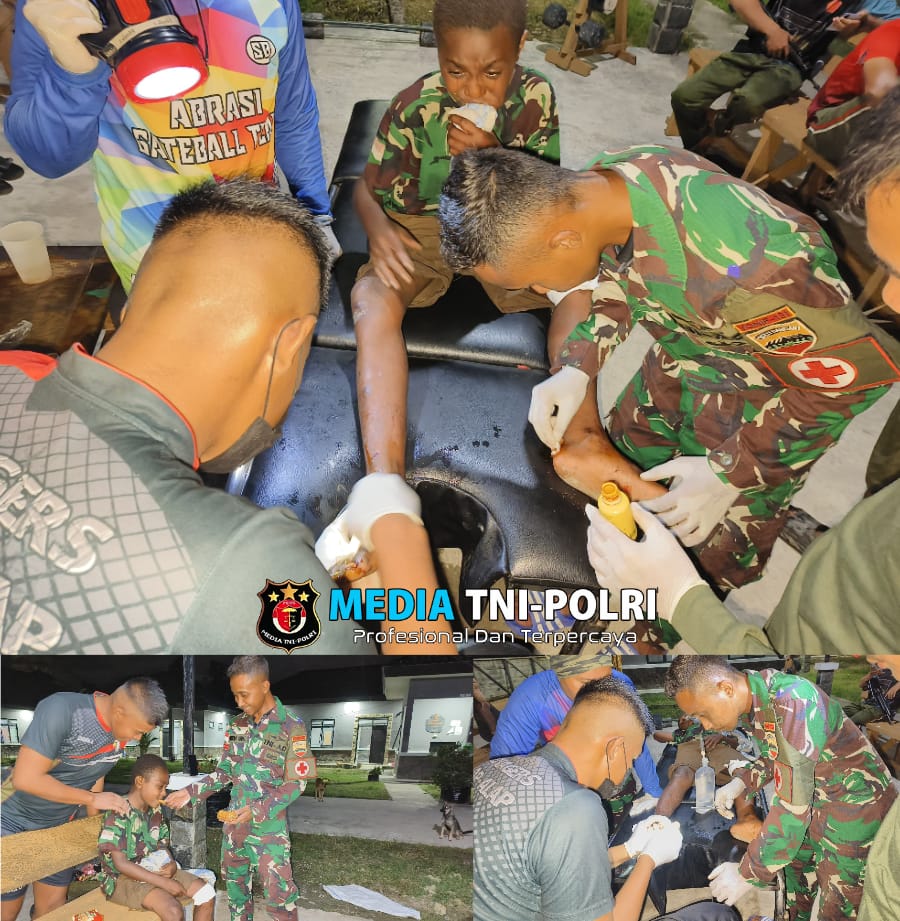 KEEROM // MEDIATNI-POLRI.COM / Satgas Yonif 131/BRS Pos Mosso menunjukkan respon cepat dan tanggap dalam memberikan pertolongan kesehatan kepada warga yang terluka di Distrik Muara Tami, Papua.