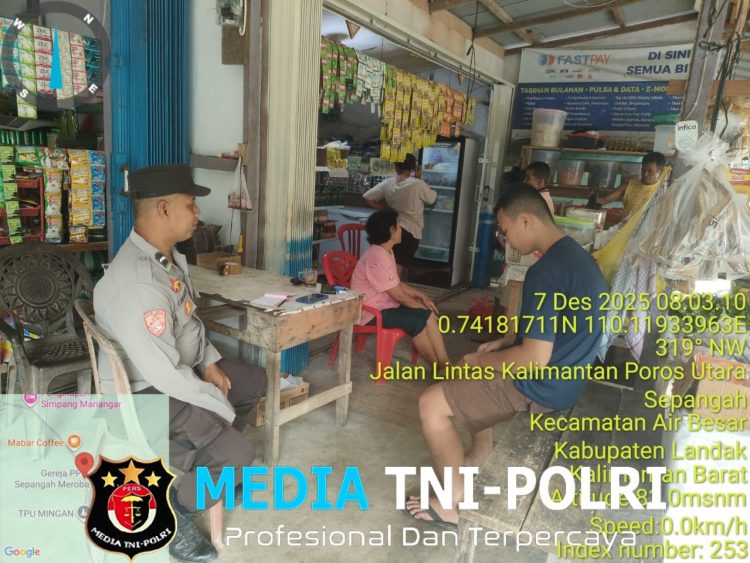 LANDAK // MEDIATNI-POLRI.COM / Polsek Air Besar ~ Polres Landak ~ Polda Kalbar ~ Personel Polsek Air Besar melaksanakan patroli siang dengan menyambangi warga dan pelaku usaha di sepanjang Jalan Lintas Kalimantan Poros Utara, Desa Sepangah, Kecamatan Air Besar.