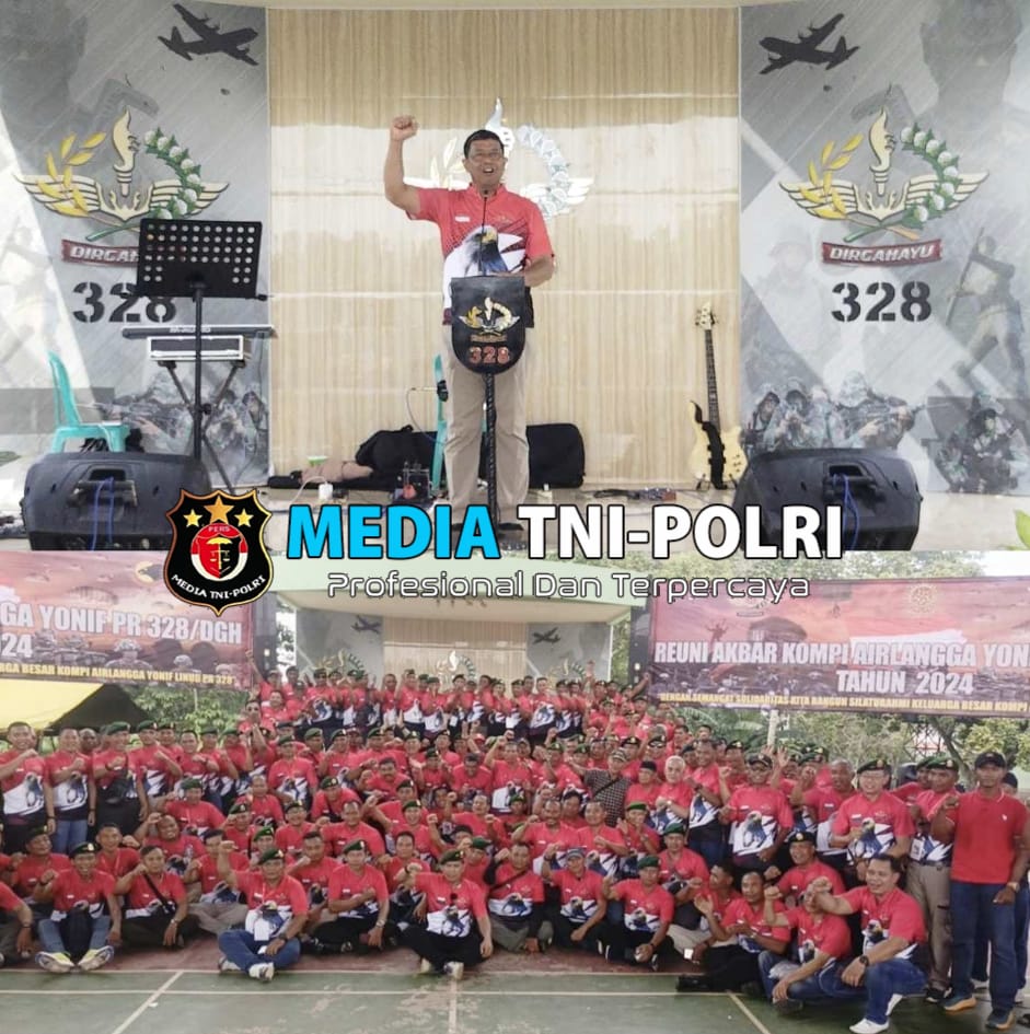 DEPOK // MEDIATNI-POLRI.COM / Kompi Airlangga Yonif PR 328/DGH menggelar acara reuni akbar dengan tema ” Dengan Semangat Solidaritas Kita Bangun Silaturahmi Keluarga Besar Kompi Airlangga Yonif Linud PR 328″ bertempat di Balai Prajurit Dirgahayu, Yonif PR 328/DGH, Divisi 1 Kostrad, Cilodong, Depok. Minggu (17/11/2024)