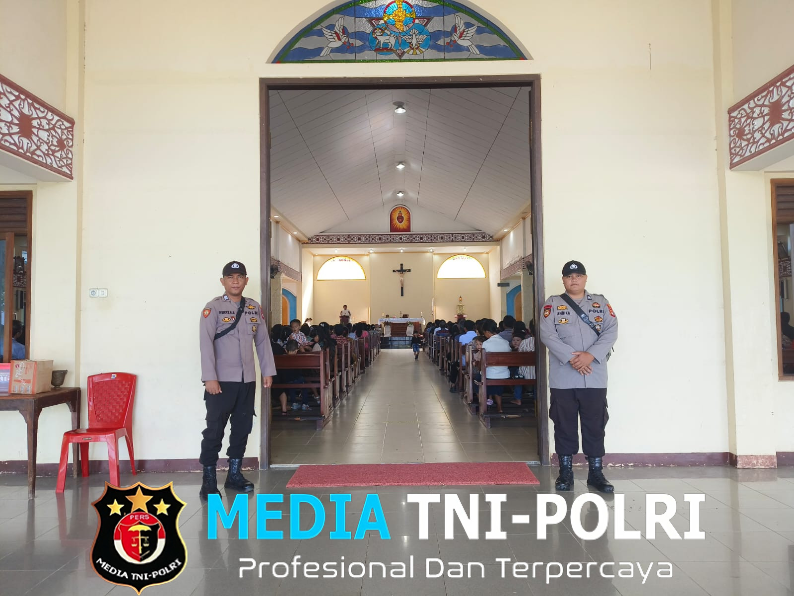 Pengamanan ibadah misa tersebut seperti yang di lakukan oleh Brigadir Herry dan Briptu Andika Radya Bagaskara untuk memastikan pelaksanaan ibadah misa umat nasrani berjalan dengan aman tertib dan lancar.