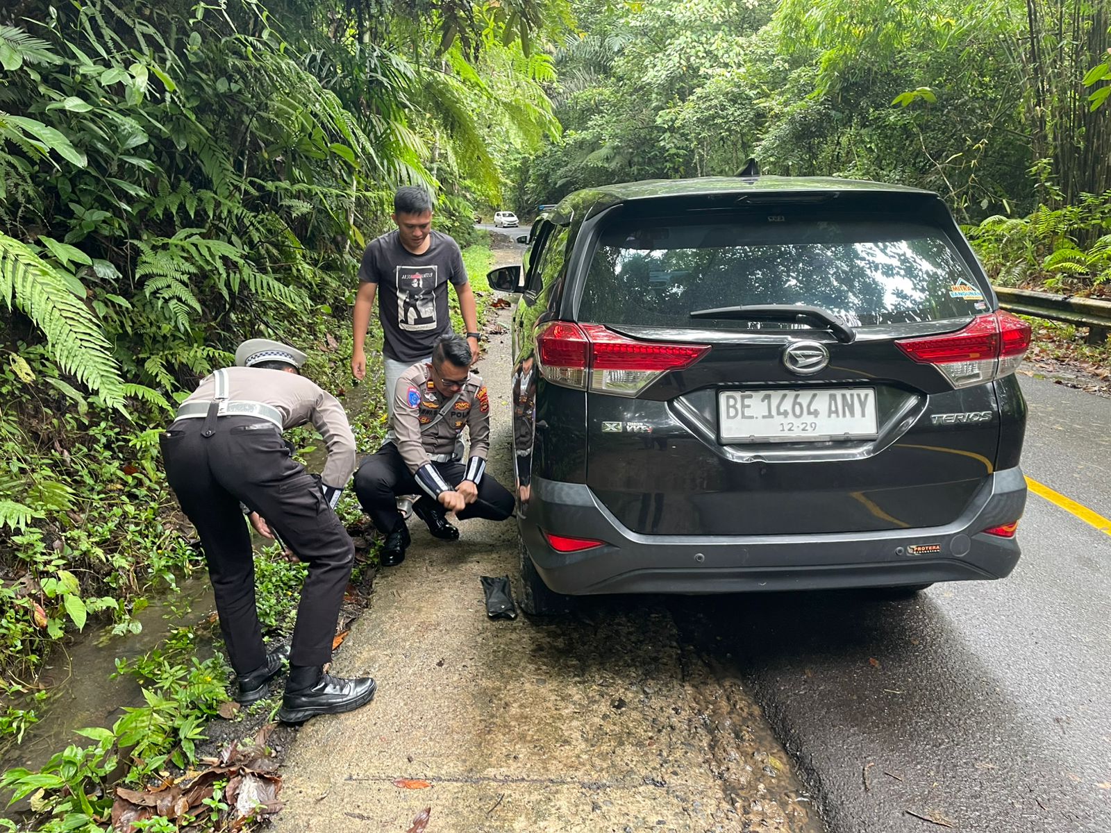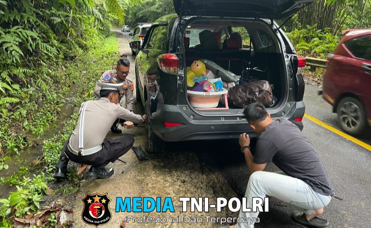 LAMPUNG BARAT // MEDIATNI-POLRI.COM / Satlantas Polres Lampung Barat menunjukkan kepeduliannya kepada masyarakat dengan membantu pengemudi yang mengalami masalah di jalan.