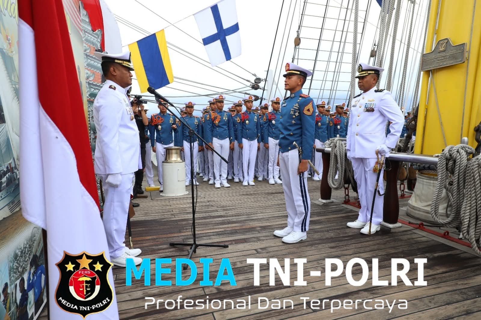 Di atas Perairan Laut Natuna, Taruna dan Taruni Akademi Angkatan Laut (AAL) dan seluruh awak KRI Bima Suci yang tergabung dalam Satuan Tugas Kartika Jala Krida (Satgas KJK) 2025 berdiri tegap mengikuti jalannya upacara.