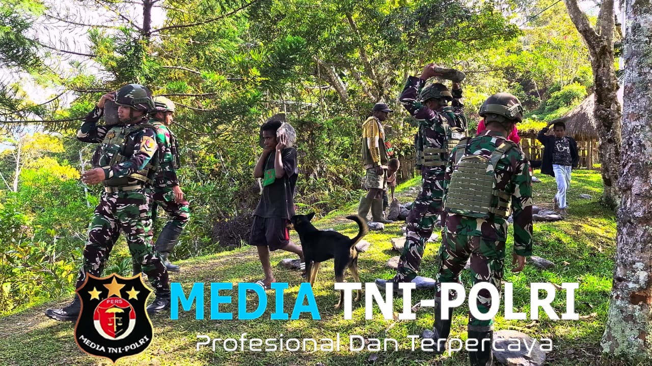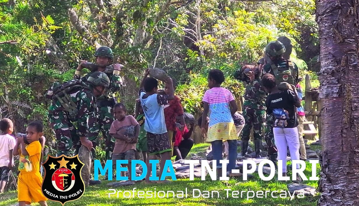 MAMBERAMO TENGAH // MEDIATNI-POLRI.COM / Satgas Pamtas RI-PNG Kewilayahan Yonif 521/DY Pos Eragayam bersama masyarakat dan anak anak melaksanakan kegiatan gotong royong pengangkatan batu di Distrik Eragayam, Kabupaten Membramo Tengah. (20/9/2025).