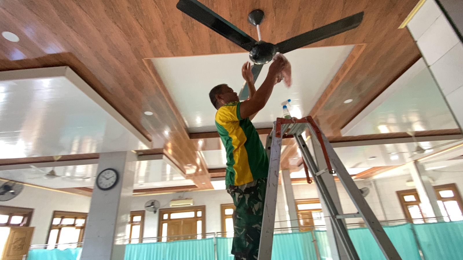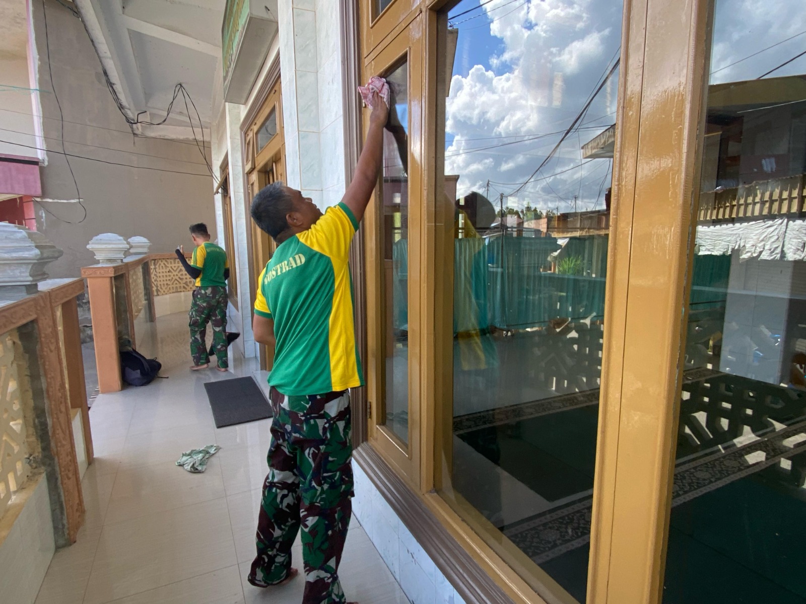 Pembersihan masjid mencakup penyapuan halaman, pengepelan lantai, serta pembersihan tempat wudhu dan kamar mandi.