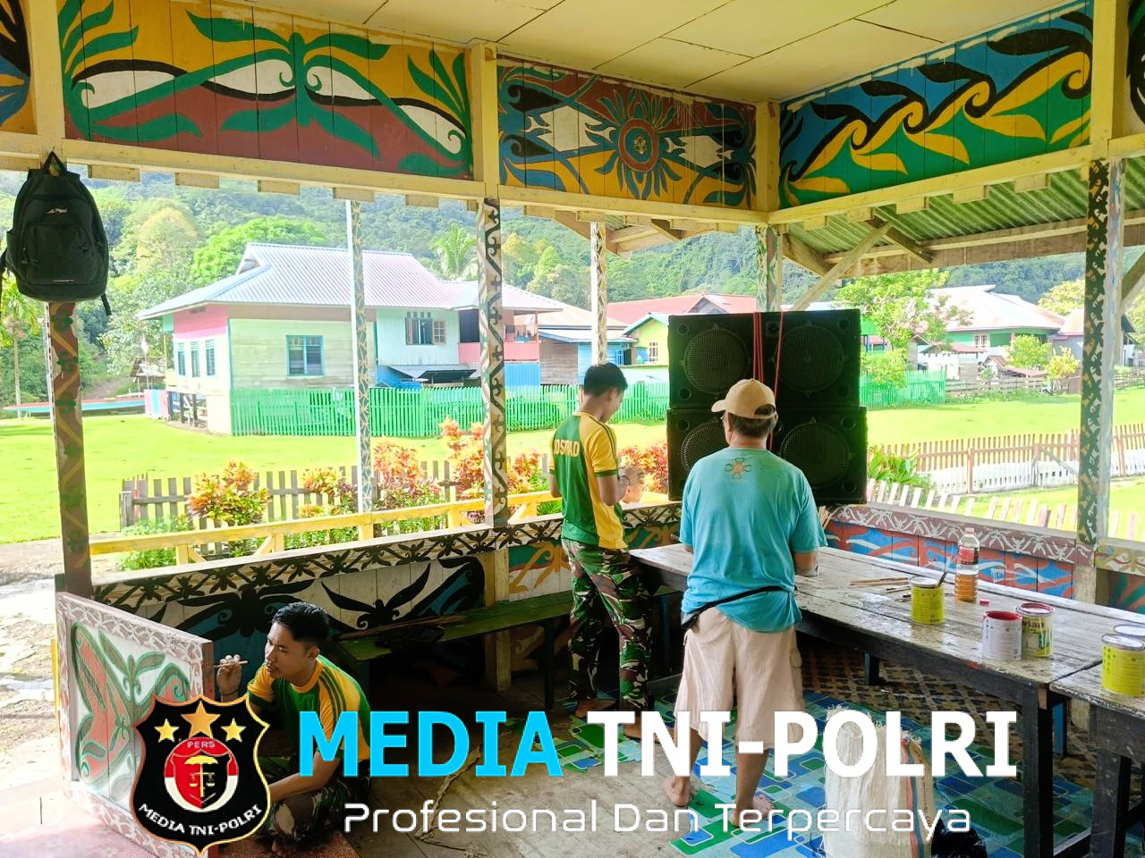 Satgas Pamtas Yonarmed 11 Kostrad Pos Lumbis turut serta membantu pengecatan dan perawatan Balai Adat di Desa Tuntulibing, Kecamatan Lumbis Hulu, Kabupaten Nunukan, Kalimantan Utara.