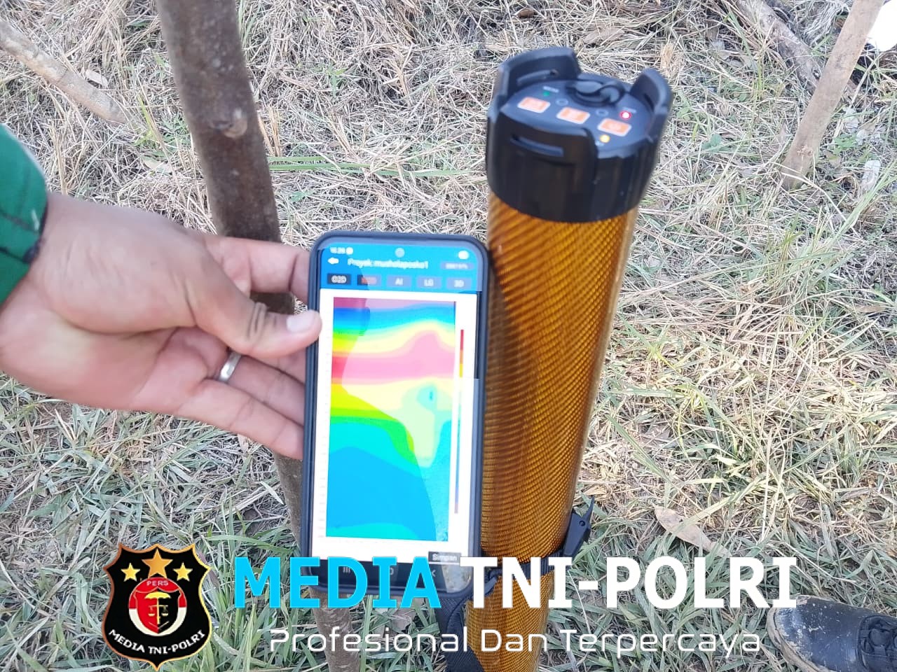 Praka Hendra bersama Serda Hardianto terjun langsung ke lapangan untuk melakukan pengecekan titik air menggunakan alat geolistrik yang merupakan perangkat survei geofisika yang mampu mengukur resistivitas (tahanan jenis) batuan di bawah permukaan tanah.