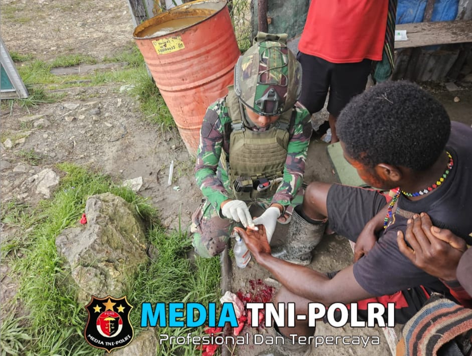 MAYUBERI // MEDIATNI-POLRI.COM / Satgas Mobile Yonif 323 Buaya Putih melakukan pertolongan pertama bagi masyarakat yang terluka akibat terkena sabetan parang di Kampung Mayuberi, Distrik Ilaga, Kabupaten Puncak, Papua Tengah, Selasa (15/10/2024).