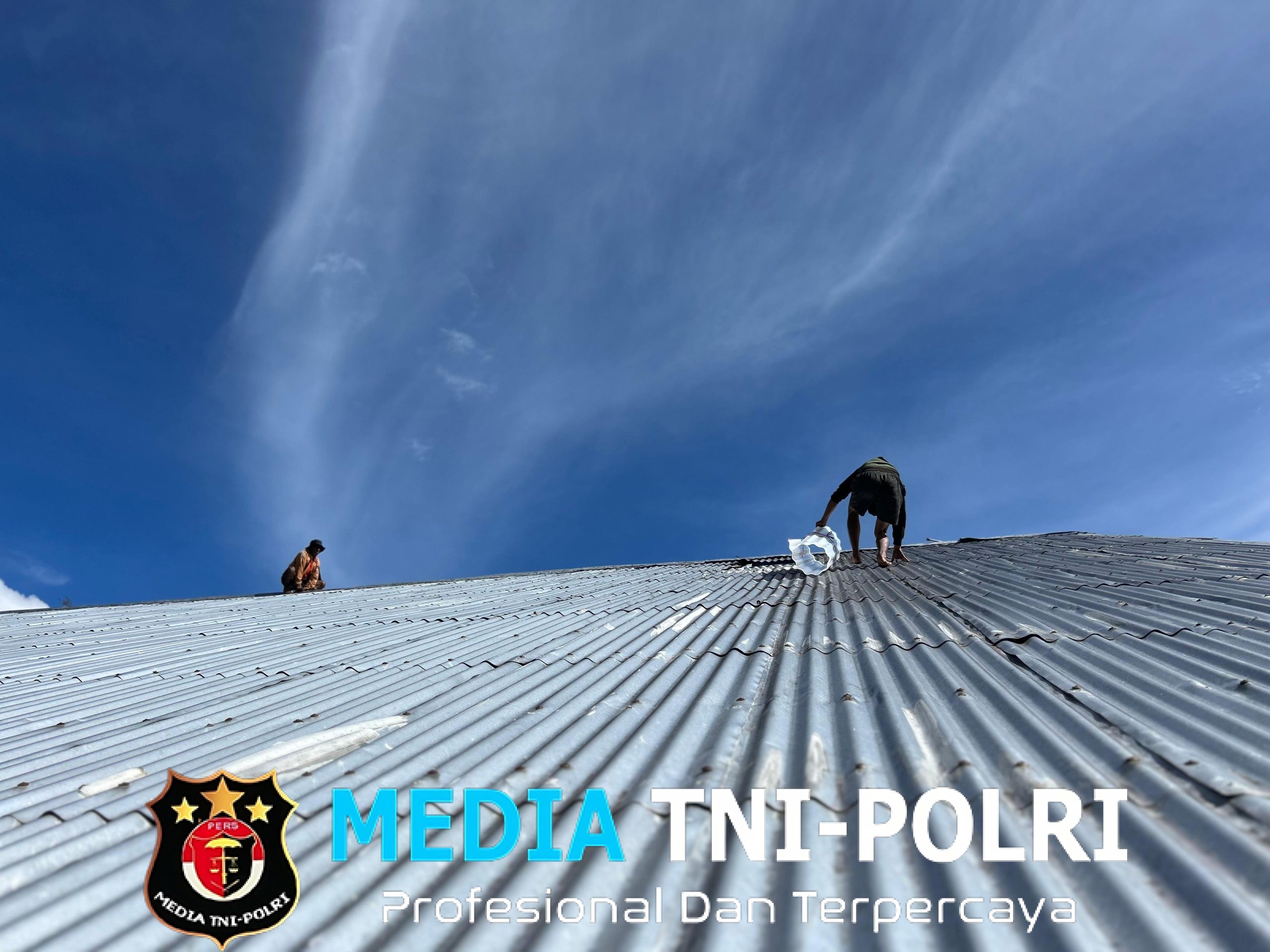 Dengan penuh semangat, prajurit TNI dan masyarakat bergotong royong mengganti seng-seng atap yang sudah lapuk agar gereja kembali layak digunakan untuk beribadah.