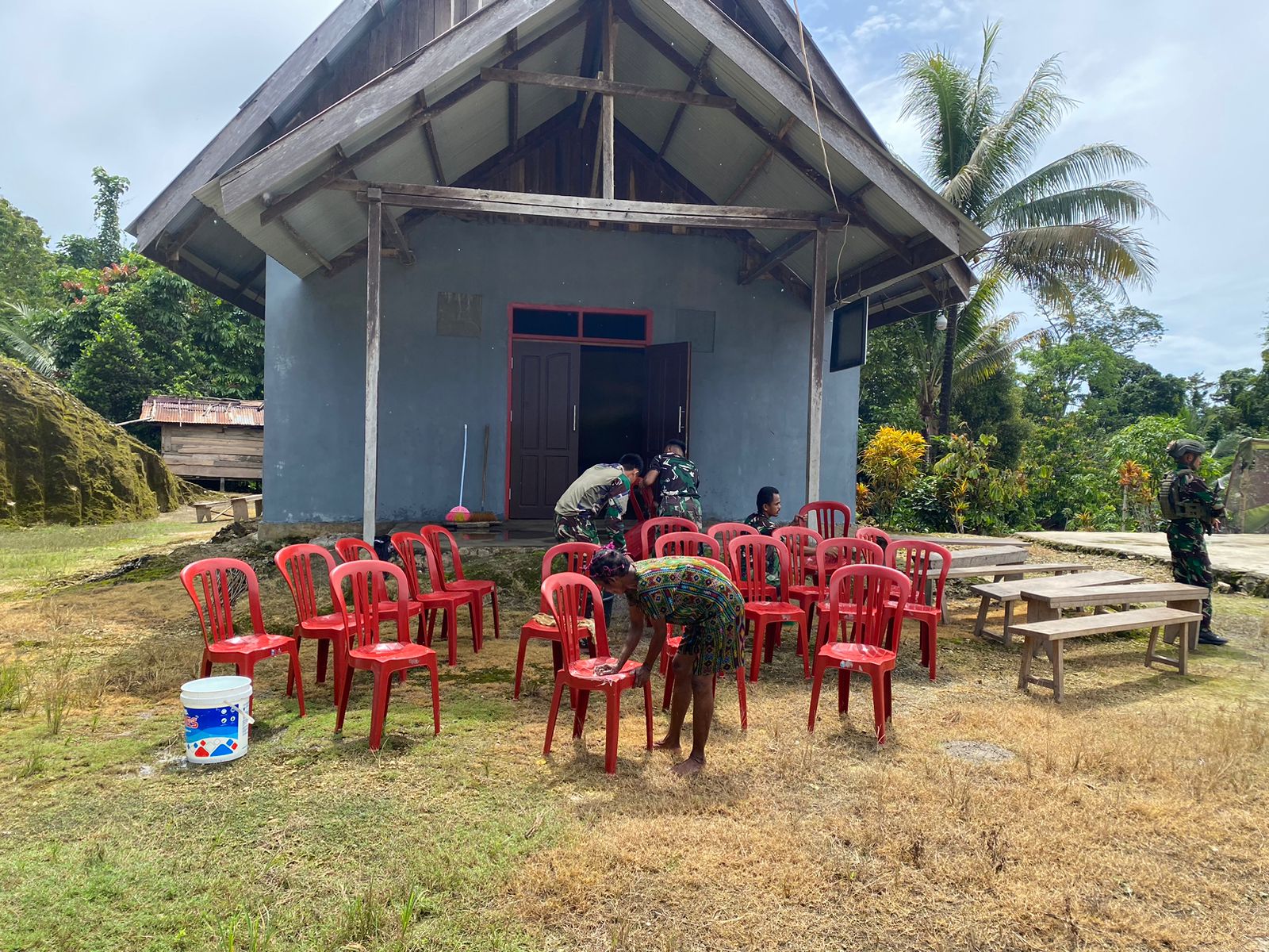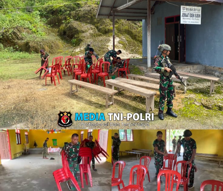 MAYBRAT // MEDIATNI-POLRI.COM / Satgas Yonif 762/VYS bersama masyarakat melaksanakan gotong royong membersihkan Gereja Jemaat Eden Klasis Subin di Kampung Subin, Distrik Aitinyo, Kab.Maybrat, Papua Barat Daya, Rabu (29/01/2025).