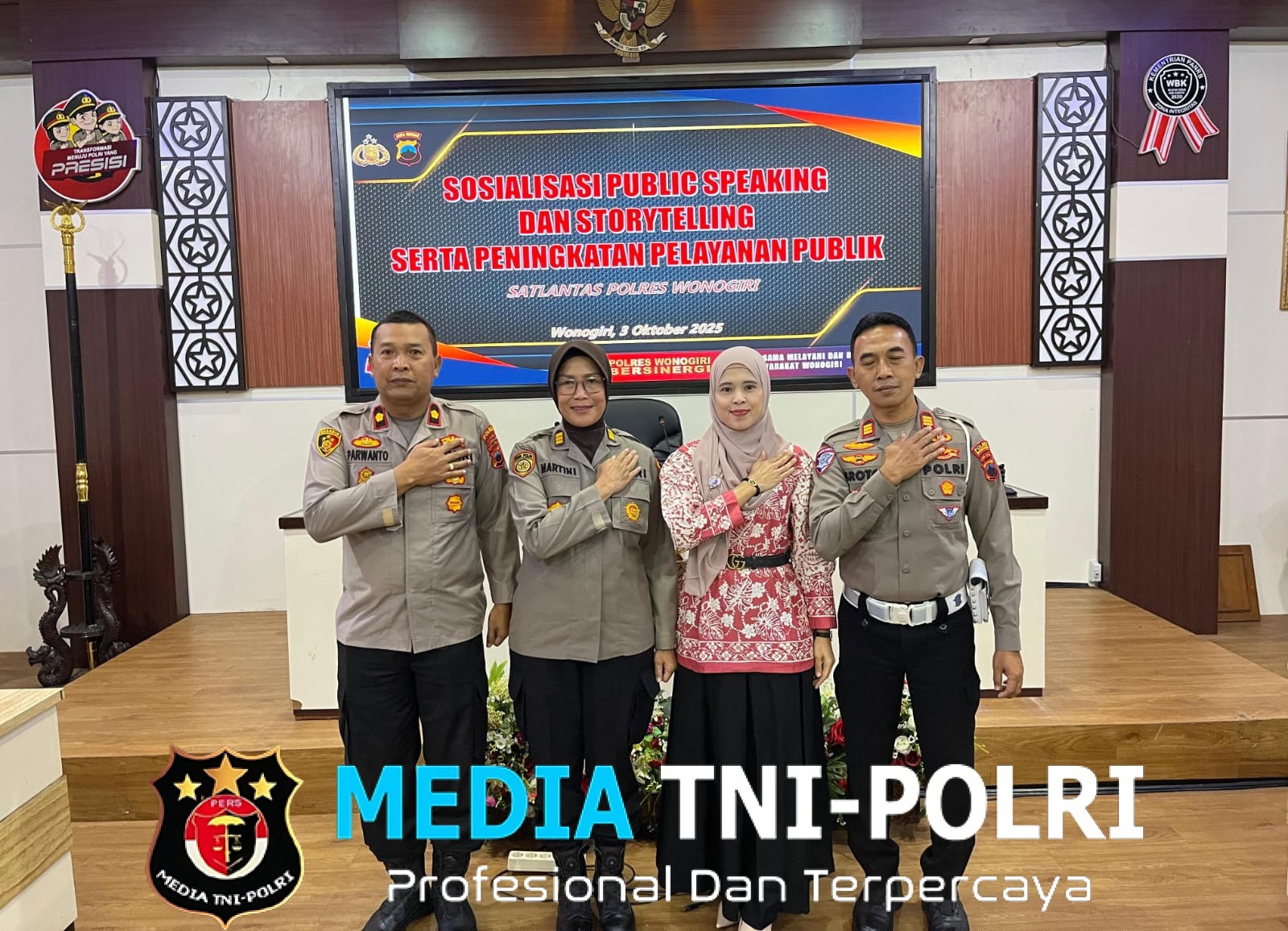 WONIGIRI // MEDIATNI-POLRI.COM / Dalam rangka meningkatkan kualitas pelayanan kepada masyarakat, Satuan Lalu Lintas (Satlantas) Polres Wonogiri menggelar kegiatan Sosialisasi Public Speaking, Storytelling, dan Peningkatan Pelayanan Publik pada Jumat (3/10/2025) bertempat di Aula Sanika Satyawada Polres Wonogiri.