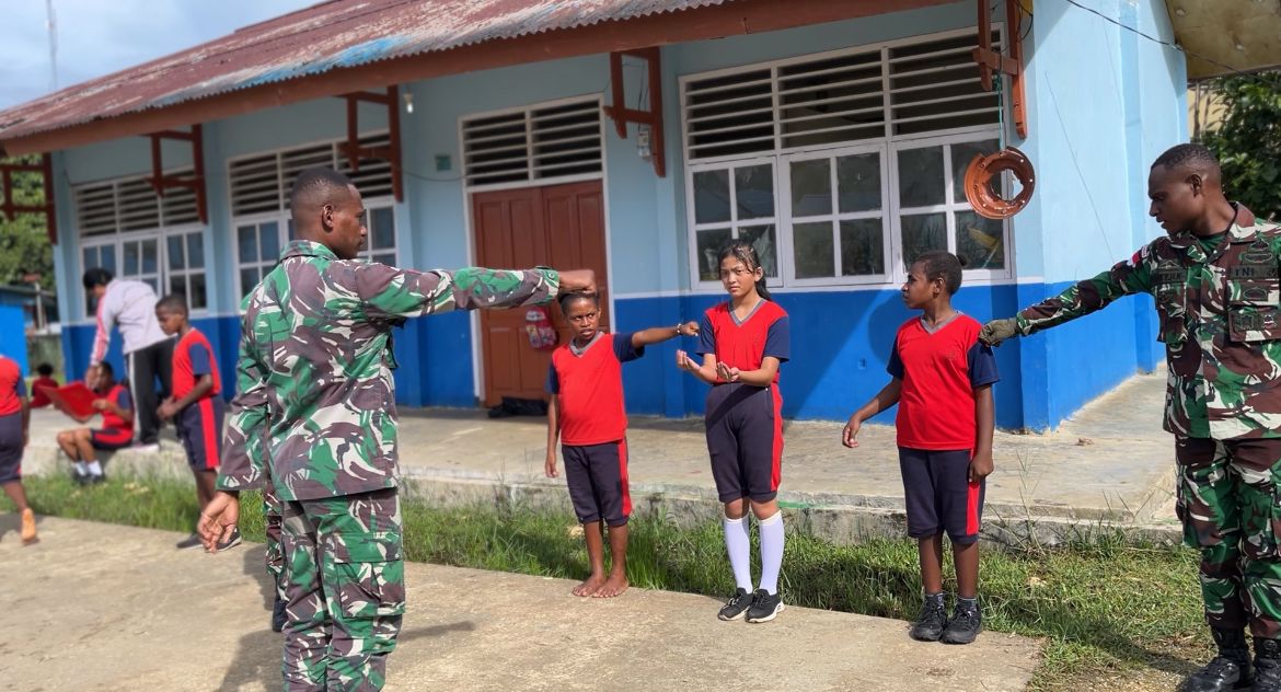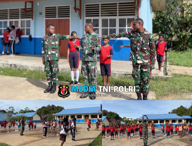 MAYBRAT // MEDIATNI-POLRI.COM / Pembentukan karakter dan penanaman disiplin sejak dini kepada generasi muda dilakukan Satgas Pamtas RI-PNG Kewilayahan Papua Barat Daya Yonif 762/VYS dengan melatihkan Peraturan Baris Berbaris (PBB) dan kegiatan senam bersama siswa dan siswi SD Inpres 13 Kumurkek,
