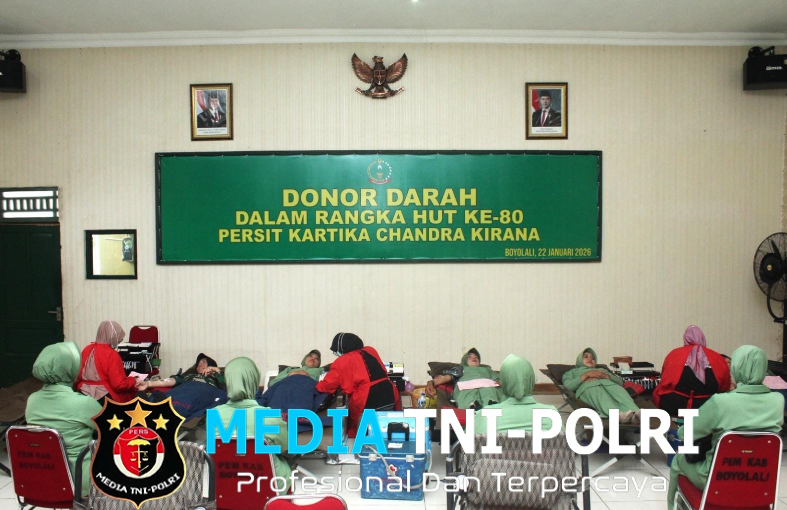 BOYOLALI // MEDIATNI-POLRI.COM / Dalam rangka menyambut Hari Ulang Tahun (HUT) ke-80 Persit Kartika Chandra Kirana, Persit KCK Cabang XLV Dim 0724/Boyolali menggelar kegiatan bakti sosial donor darah yang berlangsung di Aula Makodim 0724/Boyolali, Jalan Padanaran, Desa Tegalmulyo, Kecamatan Mojosongo, Kabupaten Boyolali, Kamis (22/01/2026).