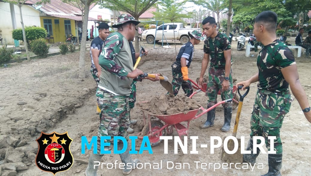 ACEH UTARA // MEDIATNI-POLRI.COM / Tumpukan lumpur sisa banjir bandang yang menyelimuti SMA Negeri 1 Langkahan mulai dibersihkan melalui aksi Karya Bhakti pada hari ini. Personel dari Yon Zipur-5/Brawijaya Malang bersinergi dengan petugas Kehutanan dan Babinsa Koramil 29/Lkh terjun langsung ke lokasi di Desa Leubok Mane,