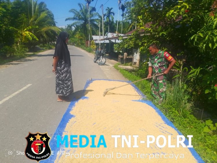 ACEH UTARA // MEDIATNI-POLRI.COM / Meski cuaca terik, Babinsa Koramil 28/Pirak Timu, Serda Juliandi, tetap bersemangat melaksanakan kegiatan pendampingan ketahanan pangan dengan membantu petani menjemur padi di Desa Teupin U, Kecamatan Pirak Timu, Kabupaten Aceh Utara, Rabu (27/8/2025).