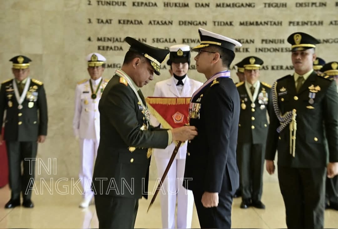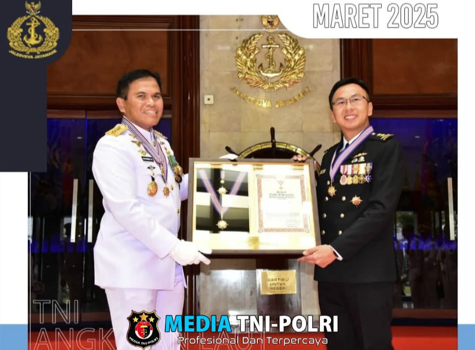 JAKARTA // MEDIATNI-POLRI.COM / Kepala Staf Angkatan Laut (Kasal) Laksamana TNI Dr. Muhammad Ali mendampingi Panglima TNI Jenderal TNI Agus Subiyanto menyematkan Tanda Kehormatan (Tahor) Bintang Jalasena Utama kepada Chief Of The Republic Of Singapore Navy Rear Admiral Sean Wat Jianwen bertempat di Mabes TNI, Cilangkap, Jakarta Timur. Rabu (19/3/2025).