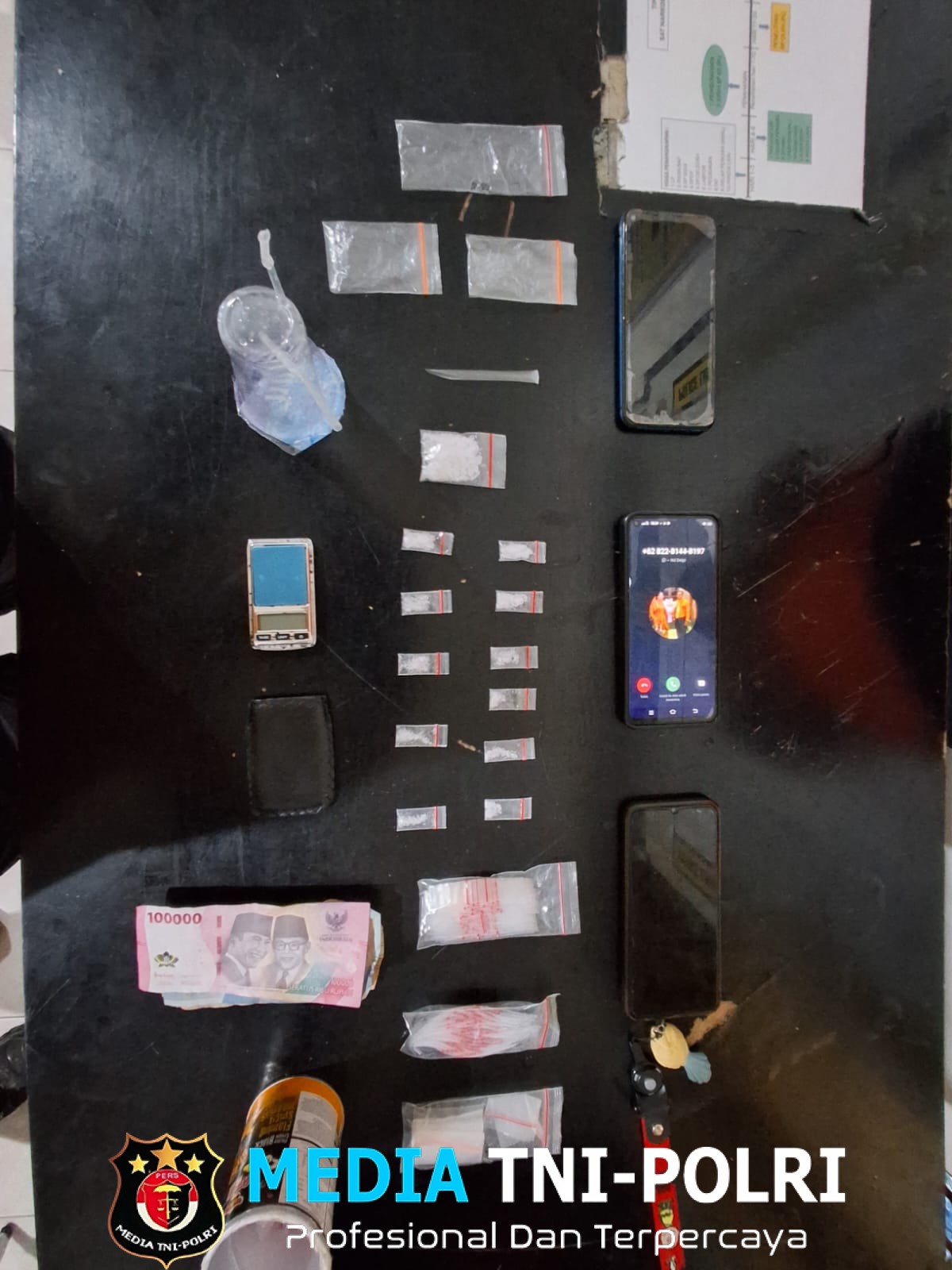 Barang bukti yang disita meliputi 11 paket plastik klip kecil berisikan narkotika jenis sabu, 1 paket plastik klip kecil berisikan narkotika jenis sabu dengan berat keseluruhan brutto 7,93 gram, 3 ball plastik klip kosong, 3 plastik klip besar kosong,