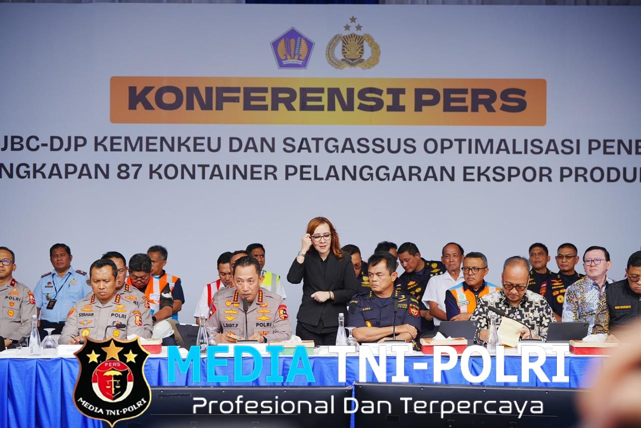 JAKARTA, MEDIATNI-POLRI.COM ~ Kapolri Jenderal Listyo Sigit Prabowo menghadiri konferensi pers operasi gabungan DJBC-DJP Kemenkeu dan Satgassus Optimalisasi Penerimaan Negara Polri terkait temuan 87 kontainer pelanggaran ekspor produk turunan CPO (Crude Palm Oil) di TPS Multi Terminal Indonesia – NPCT Common Area, Tanjung Priok, Jakarta Utara, Kamis (6/11/2025).