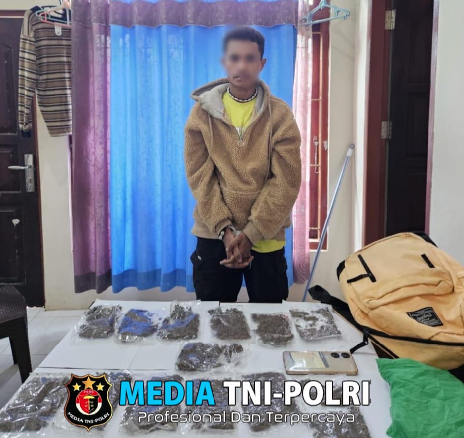 “Sebanyak 13 bungkus plastik bening ukuran besar dengan total berat 200 gram yang diduga berisikan narkotika jenis ganja