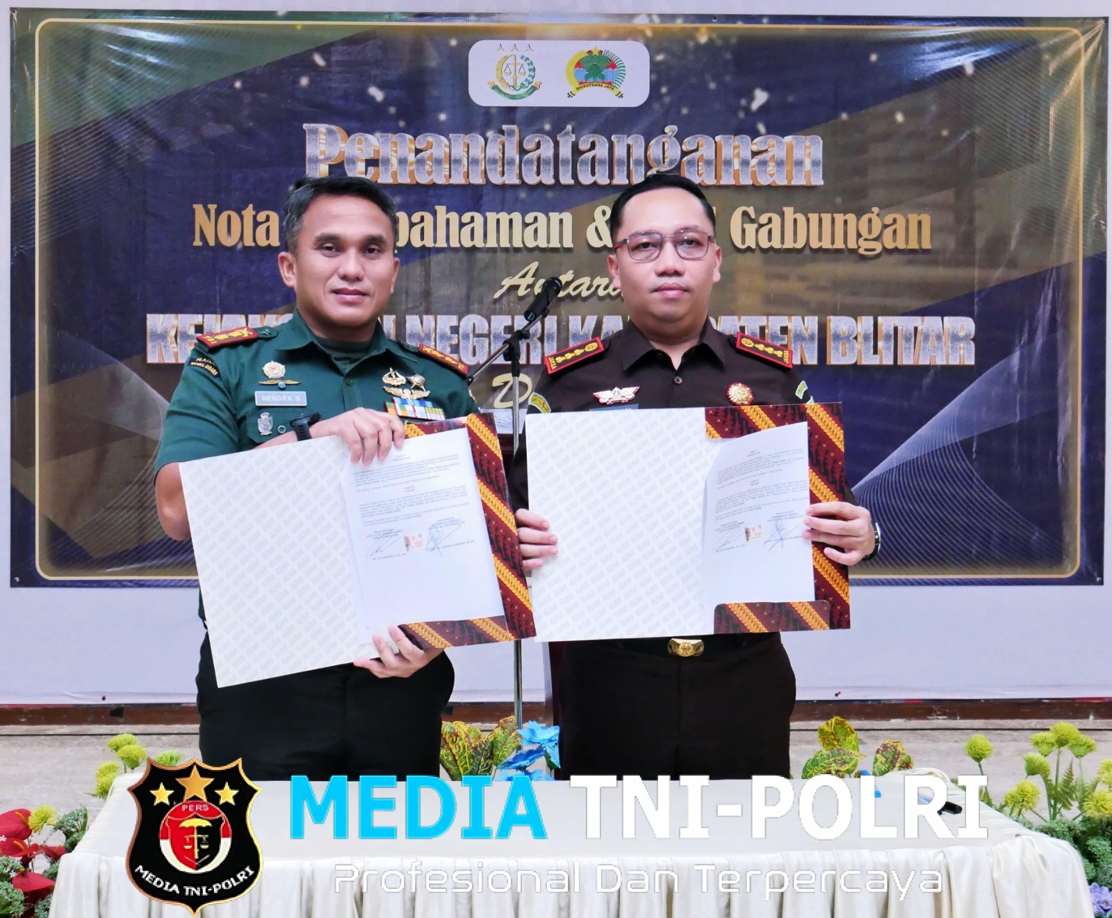BLITAR // MEDIATNI-POLRI.COM / Kejaksaan Negeri (Kejari) Kabupaten Blitar bersama Komando Distrik Militer (Kodim) 0808/Blitar menggelar penandatanganan Perjanjian Kerja Sama (PKS) sekaligus apel gabungan di Gedung Sasana Adhiyaksa,