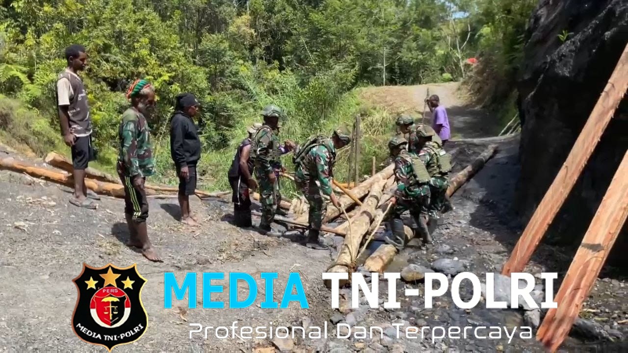 MAMBERAMO TENGAH // MEDIATNI-POLRI.COM / TNI (Tentara Nasional Indonesia) bersama warga di wilayah Papua bergotong royong membangun jembatan darurat tradisional.