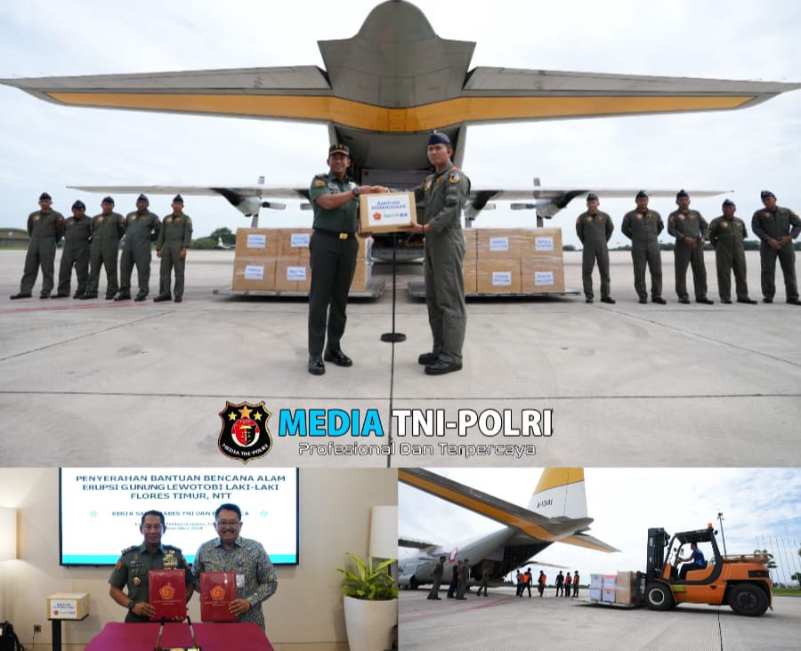 Aster Panglima TNI Mayjen TNI Novi Helmy Prasetya mewakili Panglima TNI Jenderal TNI Agus Subiyanto bersama Direktur BCA Antonius Widodo Mulyono menandatangani berita acara penyerahan barang bantuan bencana alam dan selanjutnya menyerahkan secara simbolis kepada Kru Pesawat Hercules A-1341 TNI AU yang akan mengantar bantuan tersebut.