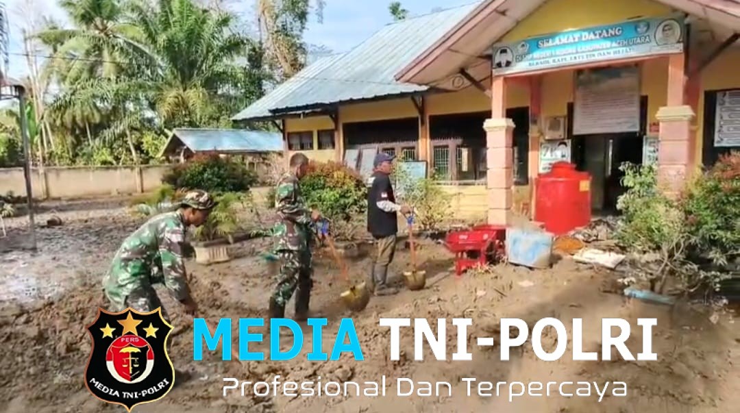 ACEH UTARA // MEDIATNI-POLRI.COM / Aksi ini ditunjukkan oleh personel gabungan Koramil 24/Nibong di bawah jajaran Kodim 0103/Aceh Utara bersama Polsek Nibong yang terjun langsung ke medan berlumpur guna memulihkan fasilitas pendidikan di SMP Negeri 1 Ranto, Desa Ranto, Kecamatan Nibong, Kabupaten Aceh Utara.