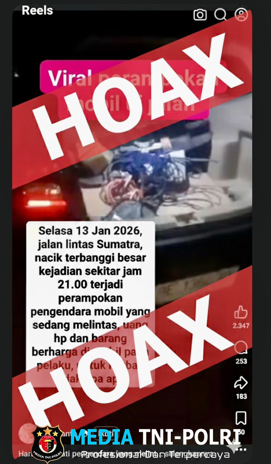 Namun, berdasarkan hasil penyelidikan dan pemeriksaan mendalam oleh pihak kepolisian, peristiwa tersebut dipastikan tidak pernah terjadi dan merupakan laporan palsu (hoaks).