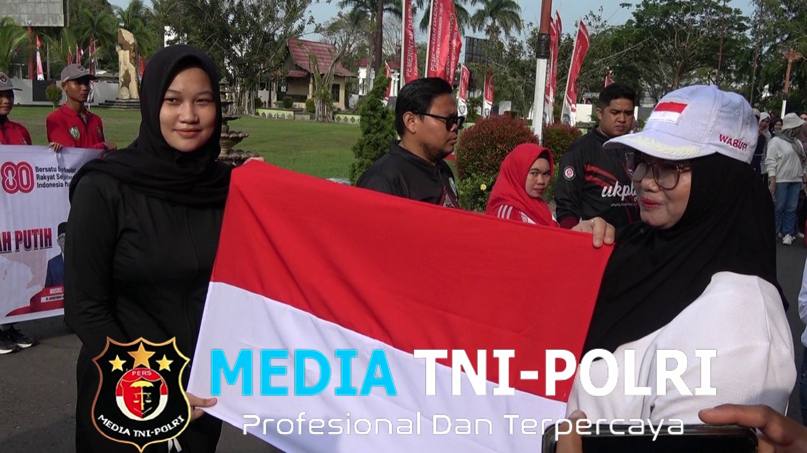 SAMPIT // MEDIATNI-POLRI.COM / Wakil Bupati Kotim Irawati S Pd Membagikan Bendera merah putih secara simbolis di halaman kantor Bupati kotim dihadiri Forkopimda jum,at (1/8/2025)