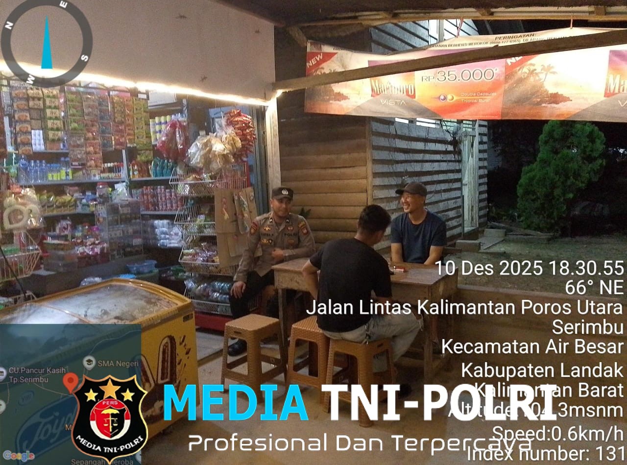 LANDAK // MEDIATNI-POLRI.COM / Polsek Air Besar ~ Polres Landak ~ Polda Kalbar ~ Rabu malam (10/12/2025), jajaran Polsek Air Besar melaksanakan patroli rutin sekaligus menyambangi warga untuk memberikan himbauan menjaga keamanan dan ketertiban masyarakat.