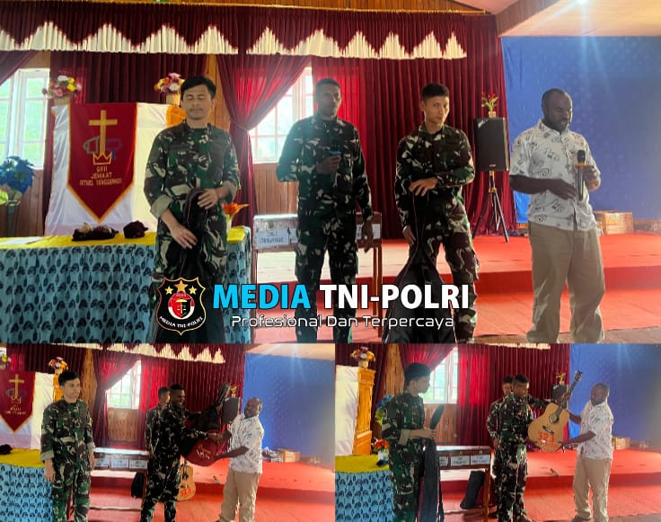 GOME // MEDIATNI-POLRI.COM / Guna semakin memperkuat hubungan dengan masyarakat di wilayah tugas, Satgas Yonif 323/Buaya Putih Kostrad TK Gome mengadakan kegiatan teritorial dengan memberikan bantuan berupa alat musik kepada Jemaat Gereja Jenggernok, Distrik Gome, Kabupaten Puncak, Papua Tengah, Minggu, (26/01/2025).